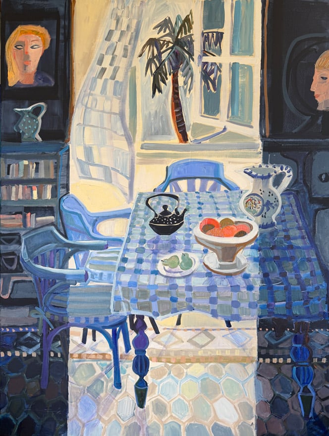 An epiphany while visiting the archaeological museum in Heraklion in Crete. 3,000 year old pottery vases still held the excitement and power of any contemporary work, reaching through the millennia to touch the viewer. No politics just art. Frame within a frame, the reflection of a mirror, a painting, an open window pulling the viewer away as distorted shadows fall across a harmony of colour that may be a rug, a striped floorboard or a window sill. The chair in the work is me, my need to sit and relax, tune into a melody or read one of the many books in my studio. Glasses at the ready.