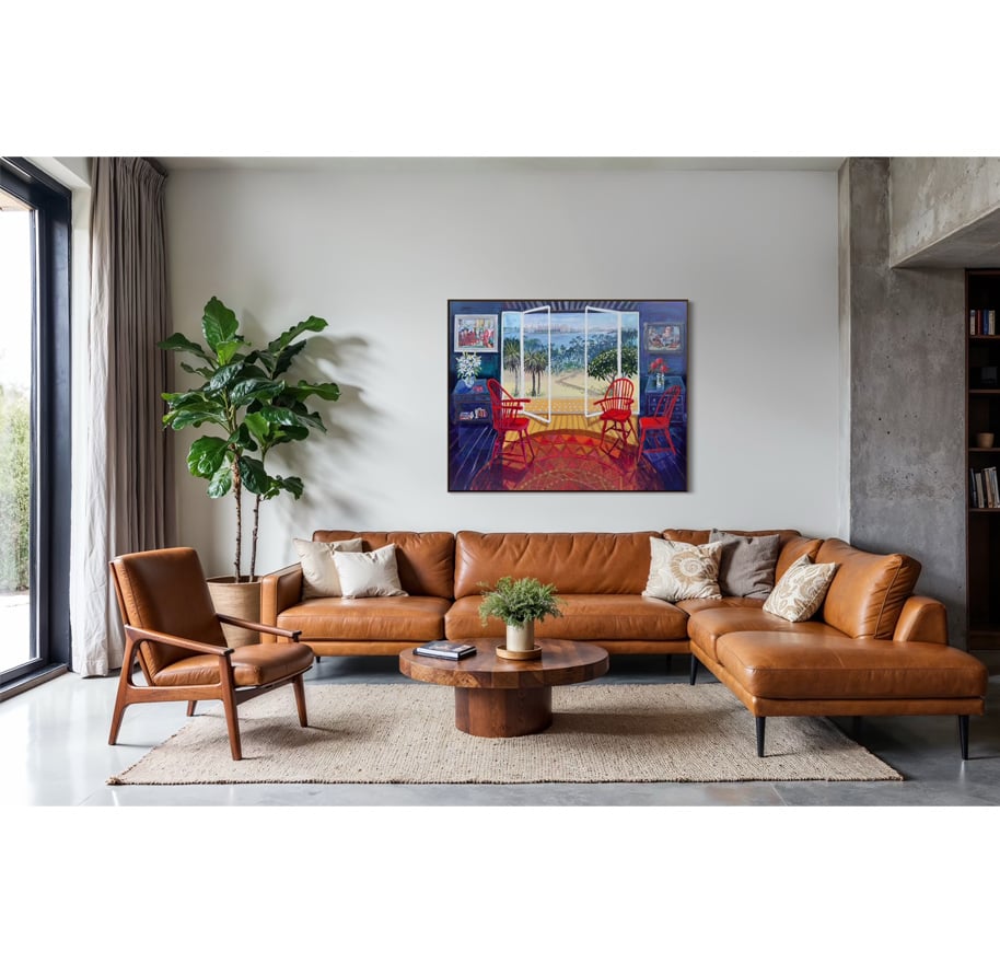 In an immersive homage to her hometown of Sydney, this widely travelled artist has created a powerful exhibition of Curated Interiors. Referencing sweeping views of Sydney Harbour from Strickland House, Redleaf Pool and across the heritage rooftops of the inner suburbs, she has drawn inspiration from mid-century art, auction houses, online shopping, as well as her own archive of photography. In doing so she appropriates a rich ephemera within her paintings. “With possibly the greatest harbour in the world, Sydney has welcomed me home with its elegance and sublime beauty. I feel the calm breeze blowing across the water. I’m not sure why it’s taken me so long to explore the beauty of my birthplace but sometimes you have to go far away to enjoy what was at your doorstep all along.” – Christine Webb