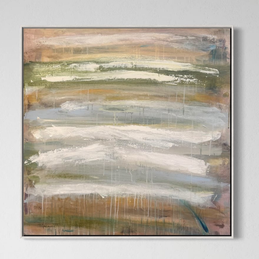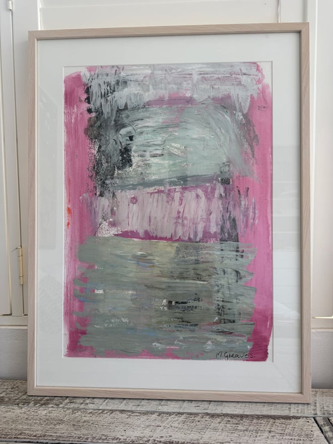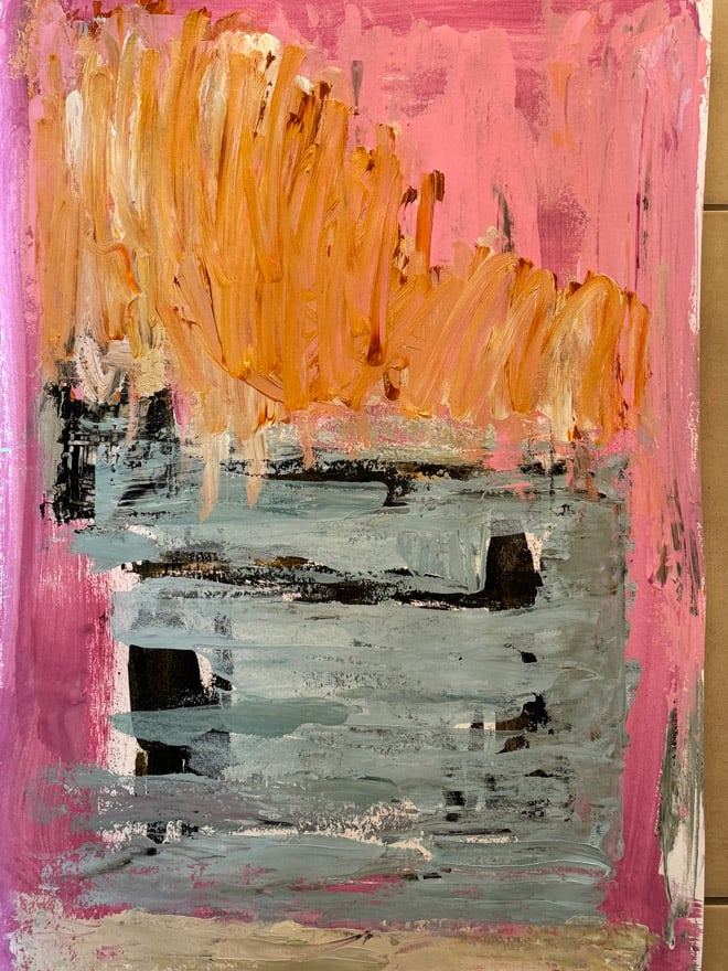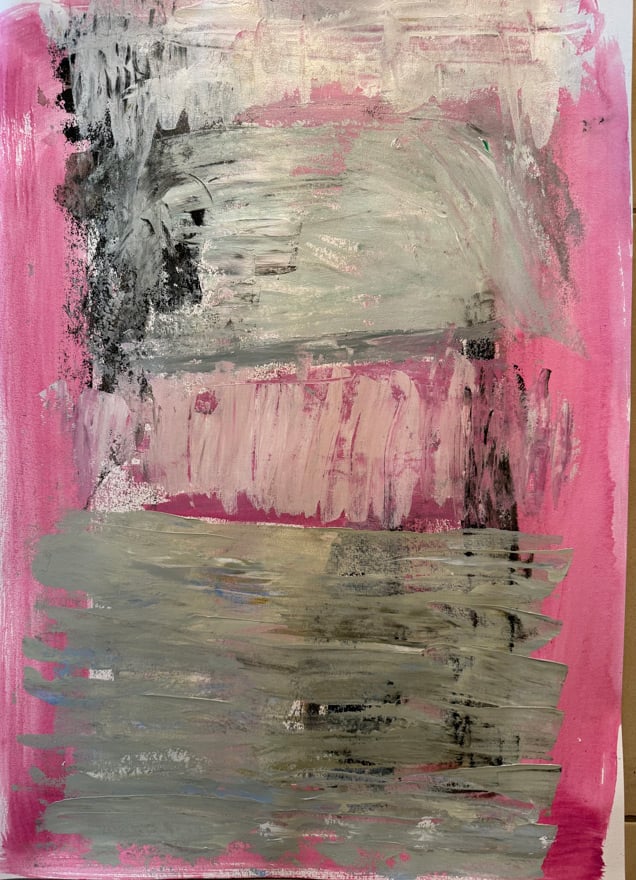“I had gone down the south coast to a cabin on East beach Kiama to have a week of plein air painting. Day 1 started with rain that continued to Day 7 resulting in the contained energy of cabin fever exploding onto the canvases in uncensored strokes and shocking pink paint! Deciding this was to be the modum operandem for the week I continued to paint in unbridled and untamed lines to represent the murky skies and pea soup seas under unrelenting rain .