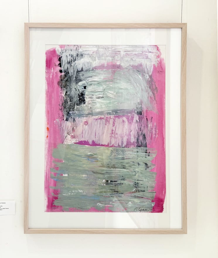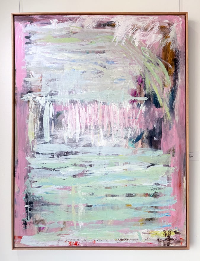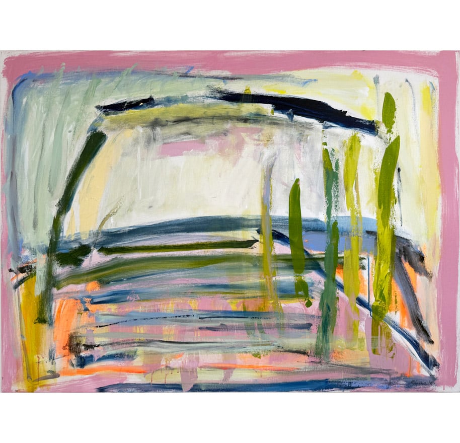 “I had gone down the south coast to a cabin on East beach Kiama to have a week of plein air painting. Day 1 started with rain that continued to Day 7 resulting in the contained energy of cabin fever exploding onto the canvases in uncensored strokes and shocking pink paint! Deciding this was to be the modum operandem for the week I continued to paint in unbridled and untamed lines to represent the murky skies and pea soup seas under unrelenting rain.