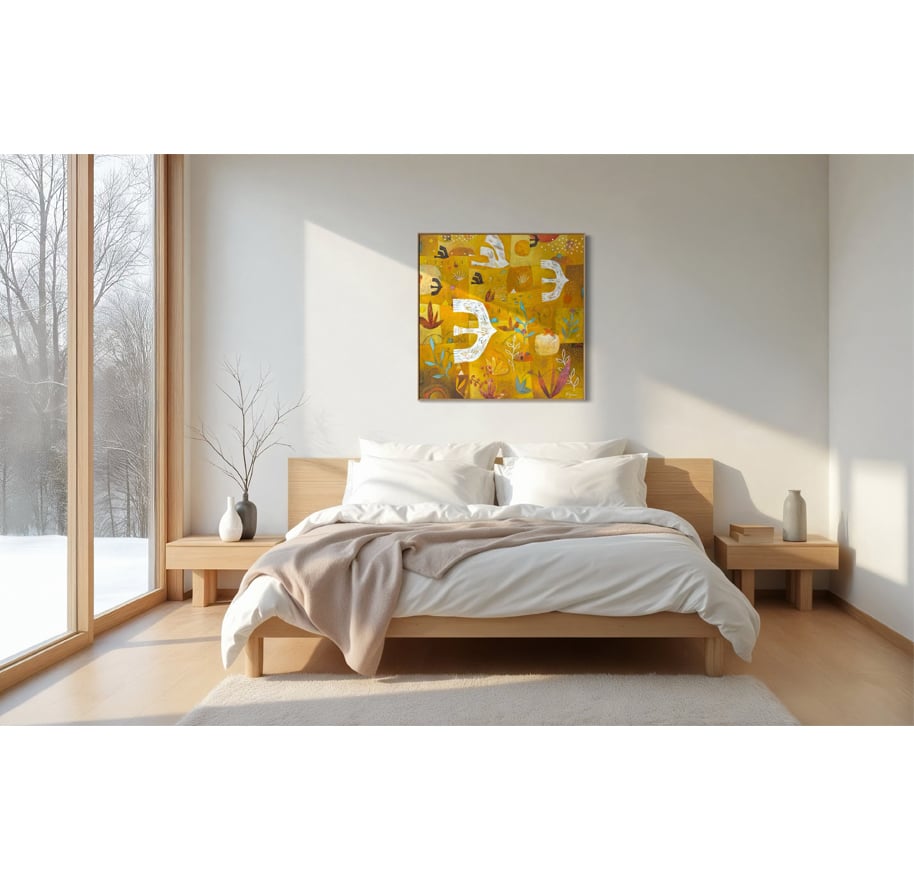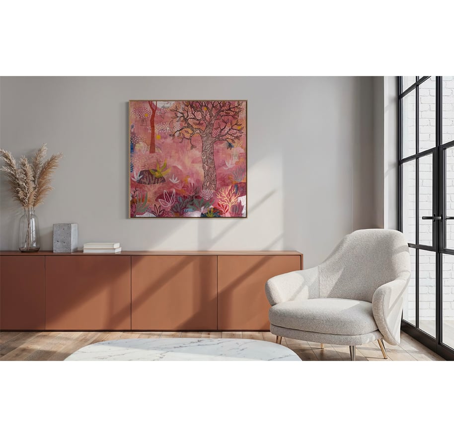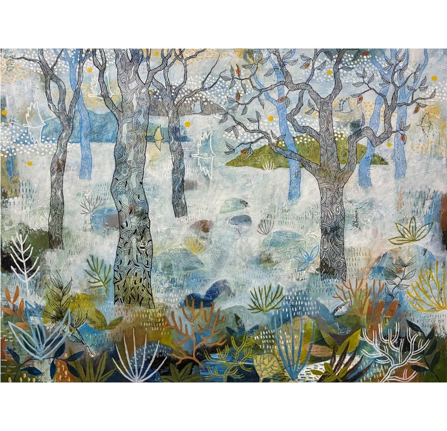 “As an artist, I’ve always relished the challenge of turning a blank canvas into something with life, curiosity and contemplation. Each painting is a story, made up from a collection of experiences and visual memories, sometimes just a fleeting moment. I enjoy taking elements of nature and playing with the composition, layering, simplifying and stylising to create my own narrative, sometimes intersecting nature, people and animals and representing the subtle impacts they have on each other and how they blend together.”