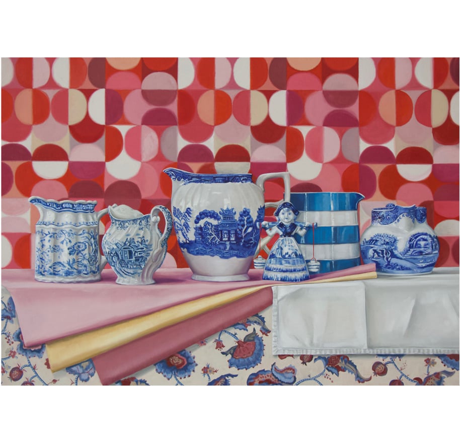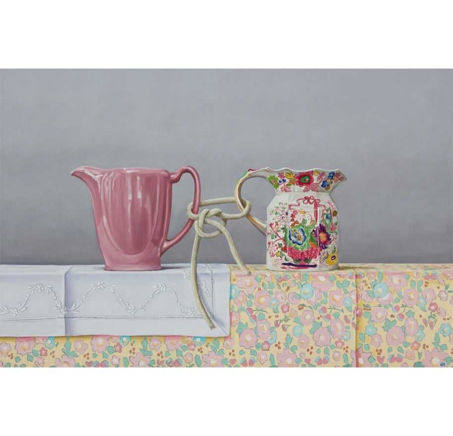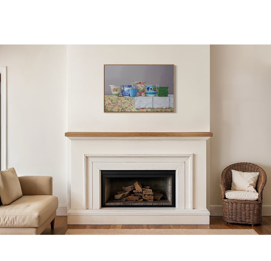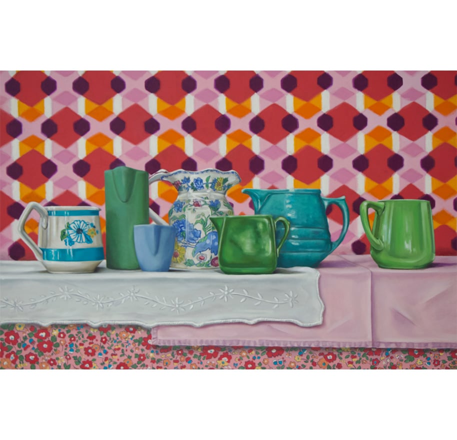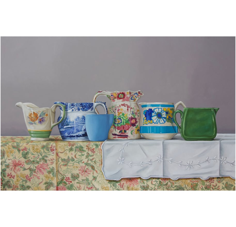 Kindred Spirits is a collection of still life paintings that explores memory, heritage, and the quiet emotional lives of everyday objects. Each work centers on vintage and antique jugs, vessels once held in steady hands at kitchen tables, and family gatherings. Paired with table linens, wallpaper, and patterned surfaces, these objects become stand-ins for the people and traditions that shaped domestic life across generations.