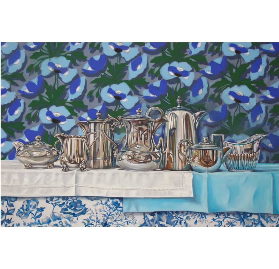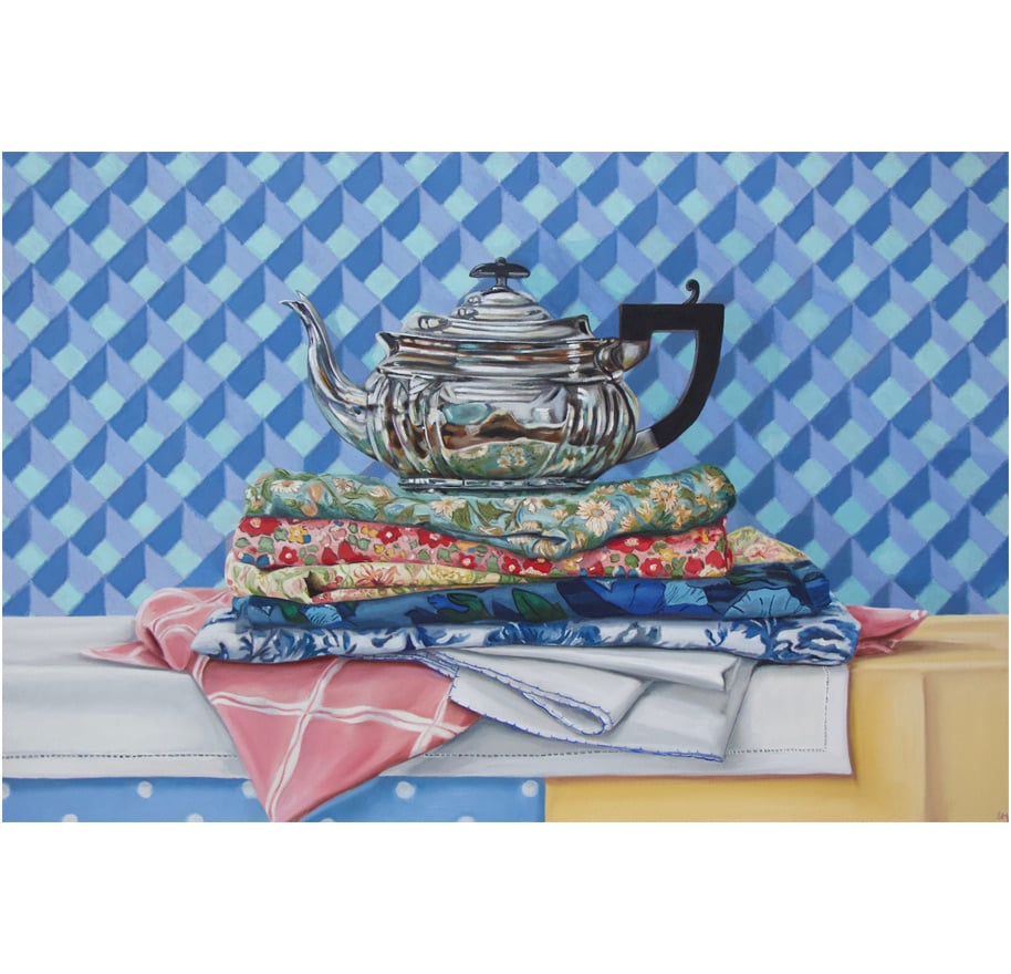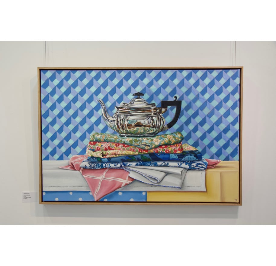 In her still life practice, Sarah is drawn to vintage tableware and fabrics as well as sentimental objects that draw on feelings of nostalgia, her inclusion of small birds and parrots in her paintings add a feeling of movement and curiosity that draws in the eye of the viewer. Sarah’s aim is to capture the everyday narrative of simple objects and birds by rendering light and reflections to create a strong sense of a quiet atmosphere. Her overall artwork style is achieved through fine detail and traditional painting methods of fine layers and glazes to create a reflective piece of artwork.