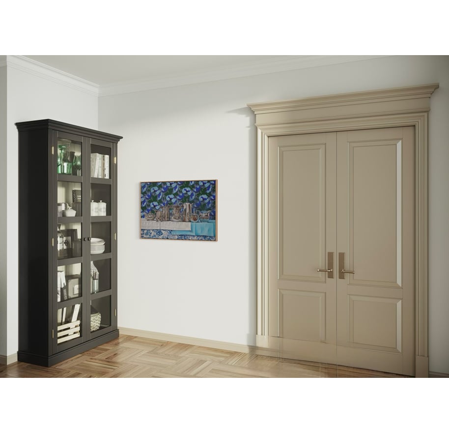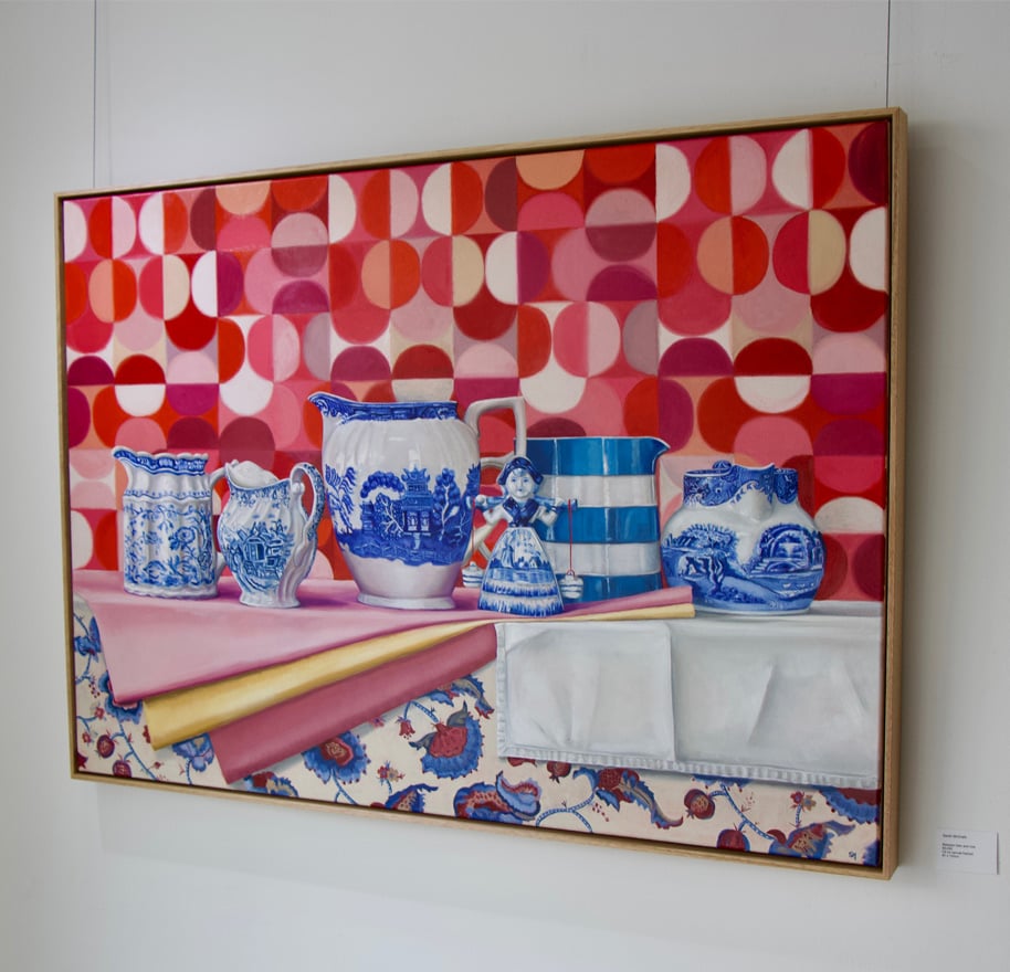 The exhibition moves between bold, pattern-rich compositions and more subdued, traditional arrangements. The patterned works echo the visual language of past interiors — wallpaper, fabric, and decorative motifs — evoking warmth, personality, and the layered nature of memory itself. In contrast, the quieter pieces offer stillness and space, reflecting moments of pause and reflection. Together, these approaches mirror how we remember: sometimes vividly and colourfully, other times softly and with restraint.