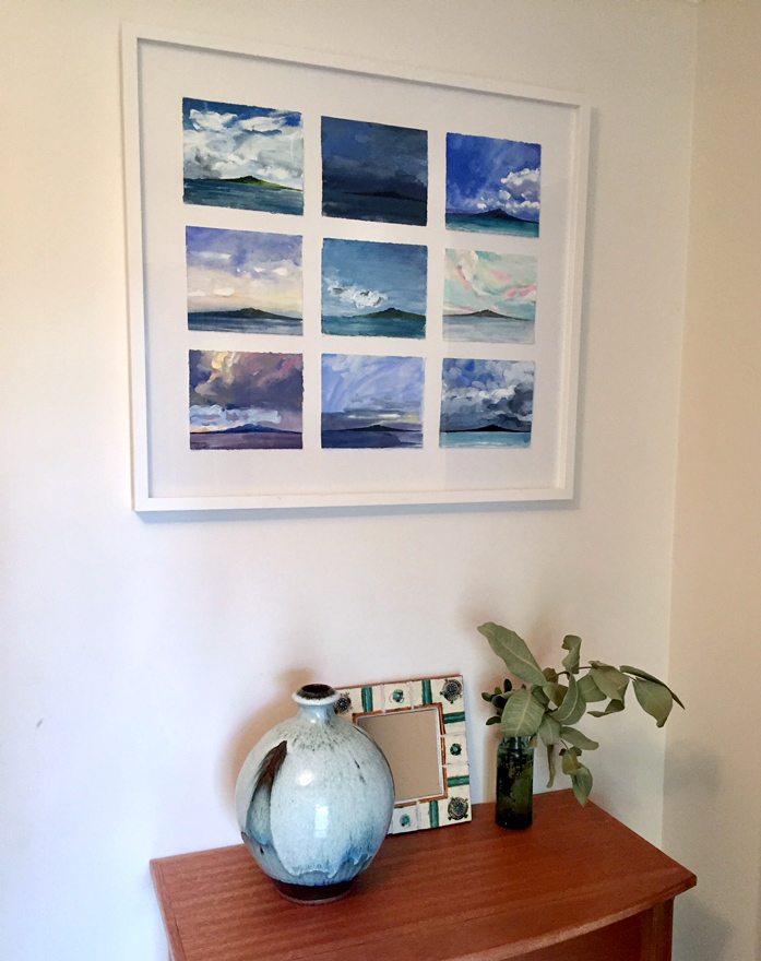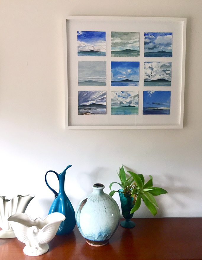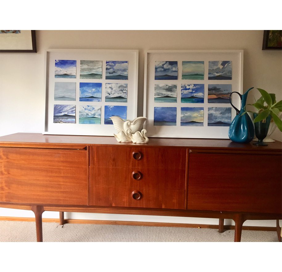 The opalescent black sand of New Zealand’s dramatic west coast was inspiration for her artworks where we are taken on a sensory journey of contrasts. The heat of the sand against the sharp cool breezes and where the baby blue green sea meets a Paynes Grey sky. You can almost smell the peaty, salty coast.
